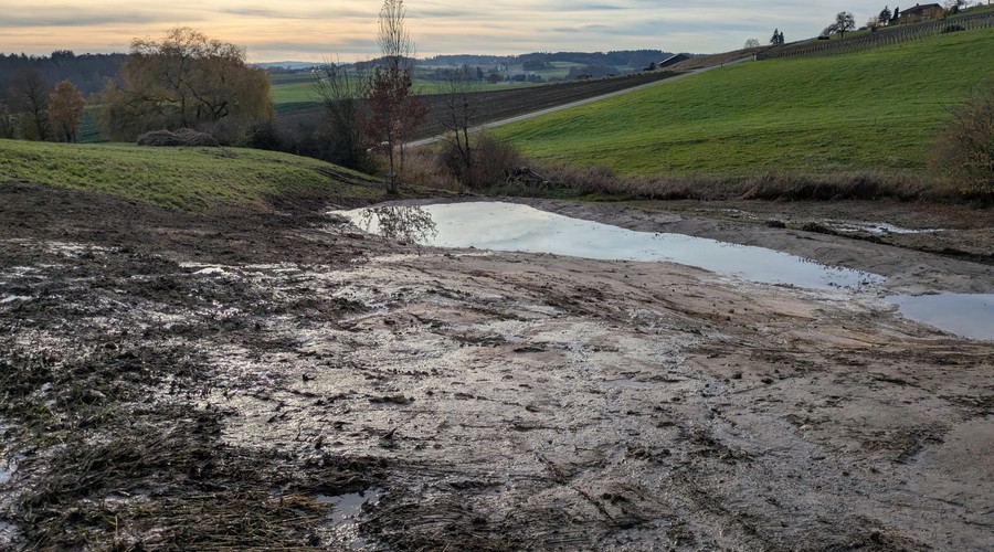 Im erweiterten Thurraum hat die IG Lebendige Thur daher in Zusammenarbeit mit Kaden + Partner AG auf landwirtschaftlichen Flächen in einer ersten Etappe mehrere neue Amphibientümpel angelegt. Entstanden sind kleine, aber entscheidende Oasen für Grasfrosch, Erdkröte und viele weitere Arten.